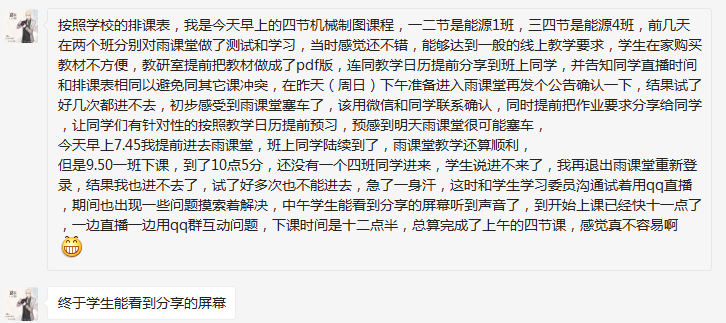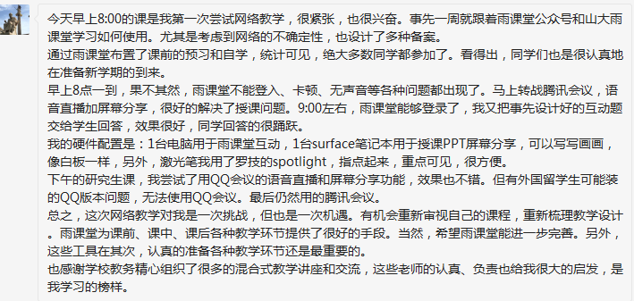 今天是开课第一天,今天上午学院教学管理团队、各系主任和专业负责人,全程在线关注学院网络教学情况。学院第一时间将上午已开课的15位教师的课堂情况反馈进行统计分析,及时对下午开课的17门课程进行指导反馈,为随后开展的教学做好充分准备。从反馈来看,老师们事先工作准备充分,同时作好了腾讯会议、QQ群等网络教学“双平台”技术应急准备,对雨课堂卡顿、堵塞等情况进行了及时应急处理。课堂教学秩序良好,在首次正式网络教学中,全部顺利完成教学任务。(以下为部分热心老师和学生的反馈)