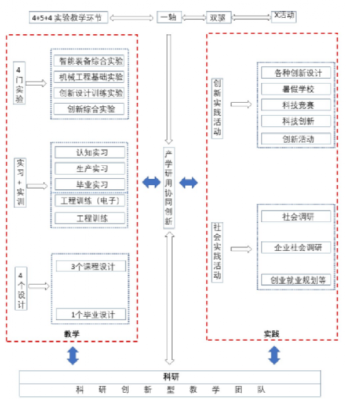 (2)建立教学、实践、科研相结合的新工科人才创新实践能力培养模式:设计校内“字(4+5+4实践教学环节模式,创建校外一轴双驱)创新实践活动