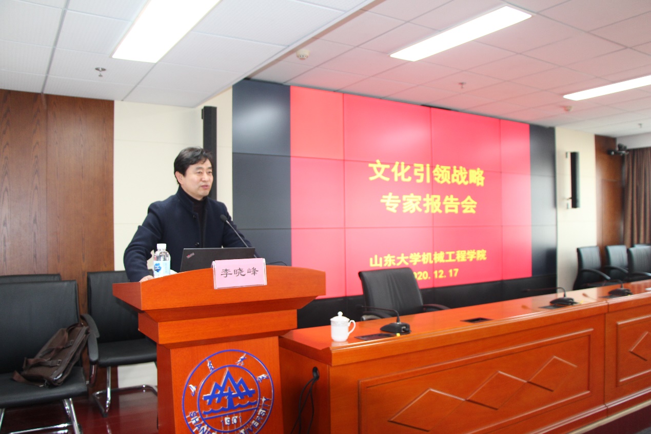 12月17日下午,机械工程学院在创新大厦1103举办了文化引领战略专题报告会,报告会邀请艺术学院党委书记、威海校区艺术学院院长李晓峰教授作了题为“百廿学府与文化引领战略”的报告。机械工程学院院长黄传真、党委书记刘杰及领导班子成员、机关全体人员、教师党支部书记、35岁以下青年教师、师生代表参加了报告会。报告会由学院党委书记刘杰主持。
