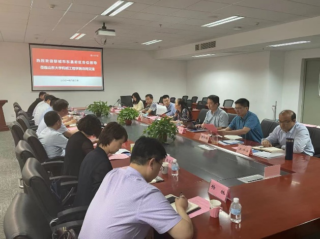 魏雷介绍了东昌府区的情况,他指出,聊城东昌府区是全国综合实力百强区、全国科技创新百强区、全国投资潜力百强区,也是闻名遐迩的中国“江北水城·运河古都”,经济实力雄厚,近年来东昌府区经济布局和经济结构不断优化,当地的汽车零部件、精品钢管、新能源汽车和轴承保持器等厂家在政府的谋划整合下不断焕发新活力,希望下一步能够与机械学院充分挖掘合作潜力,建立合作机制。孟凡志同志简要介绍了当地地方企业的整体规模、近年发展趋势、后续地方企业的整体规划方向等情况;东昌府区政府科技局李明艳同志以及政府组织部(人才办)卢宪慧同志分别简要介绍了当地在高端人才、高新技术、科研成果转化的需求以及东昌府区政府近年来在高端人才引进培养的主要实施措施、优势政策等情况。