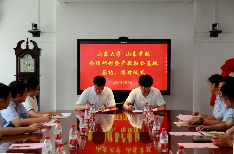 随后,姚鹏和方树鹏作为校企双方代表签订“山东大学-章鼓研究生产教融合基地协议”。万熠和方润刚为山东大学产教融合基地揭牌。