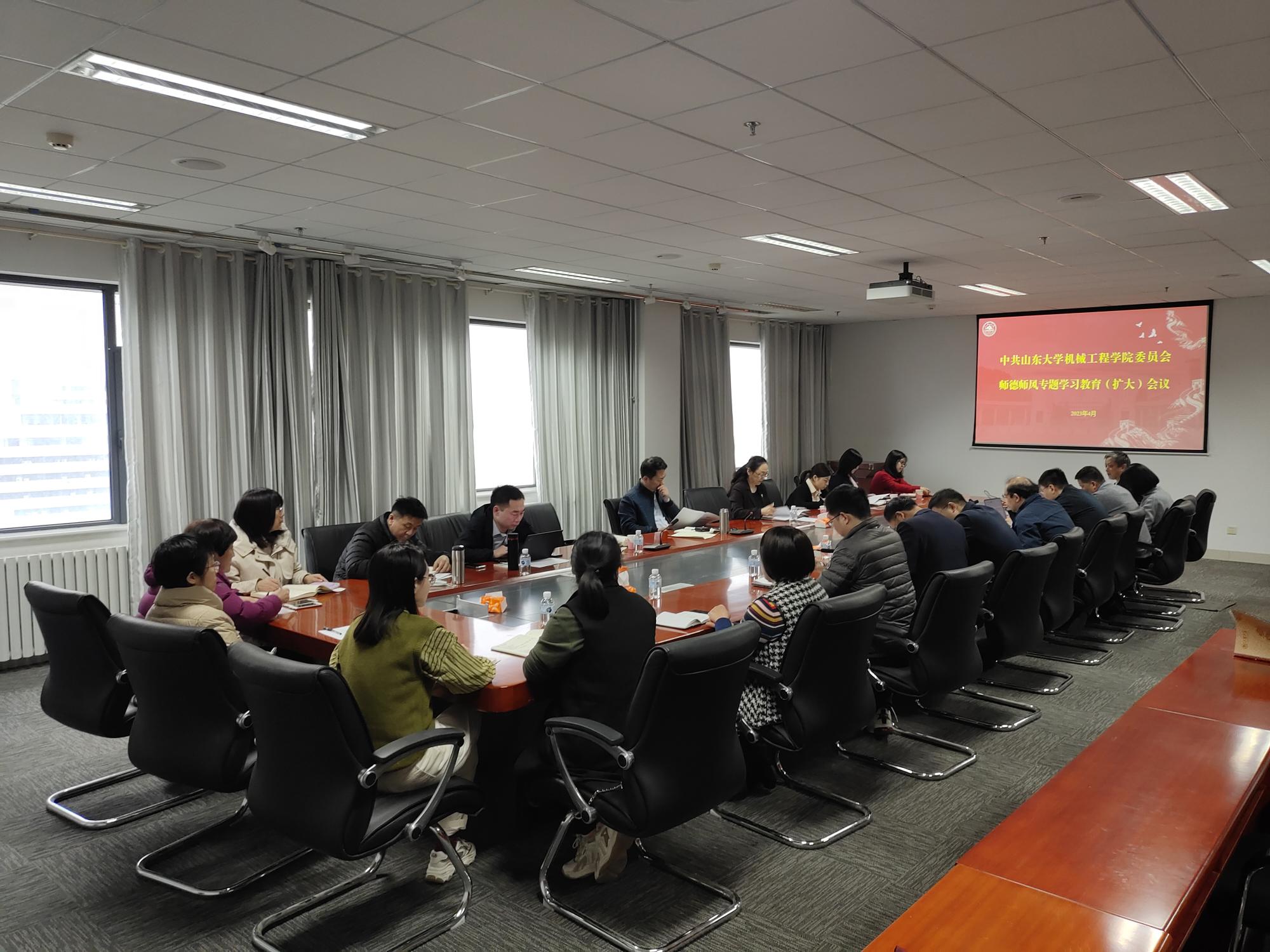 4月4日,为深入学习贯彻习近平总书记有关师德师风建设的重要论述,聚焦聚力“两个先行先试”,加强教师队伍思想政治教育和师德师风建设。机械工程学院在千佛山校区1102会议室召开师德师风教育专题会议。党委书记刘杰、院长万熠出席会议,党委副书记、学院师德师风建设领导小组分管负责人滕玉军主持会议。