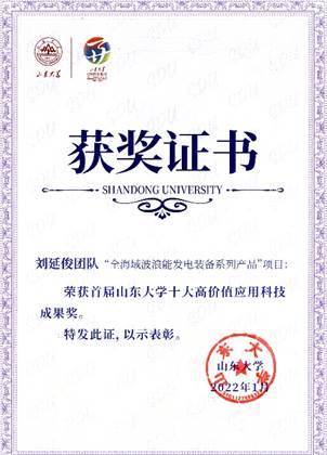 1月11日,山东大学科技创新大会在山东大学中心校区举行,会上举行了山东大学首届十大高价值应用科技成果颁奖典礼,机械工程学院刘延俊教授团队的“全海域波浪能发电装备系列产品”荣获该奖项。山东大学校长樊丽明和济南市副市长孙斌共同为获奖者颁发证书和奖杯。