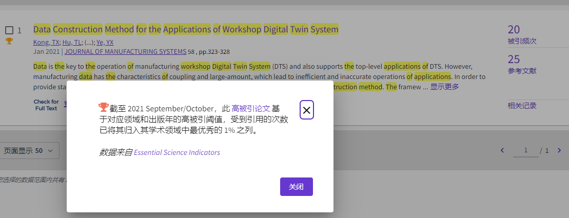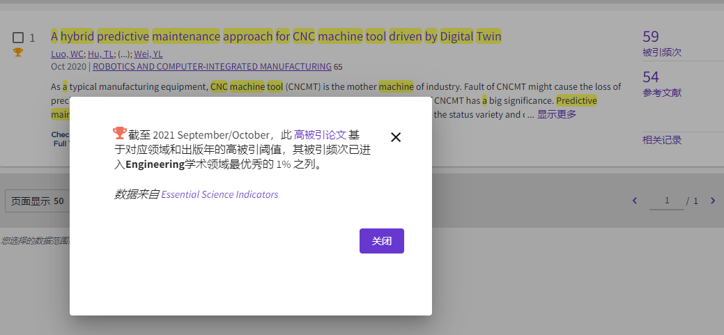 近日,ESI公布了2021年度高被引论文。胡天亮教授团队两篇数字孪生领域相关论文进入ESI高被引,分别为2020年10月在《Robotics and Computer-Integrated Manufacturing》 期刊发表的论文”A hybrid predictive maintenance approach for CNC machine tool driven by Digital Twin”,2021年1月在《Journal of Manufacturing System》发表的论文“Data Construction Method for the Applications of Workshop Digital Twin System”。截至 2021 September/October,此两篇高被引论文基于对应领域和出版年的高被引阈值,其被引频次已进入Engineering学术领域最优秀的 1% 之列。