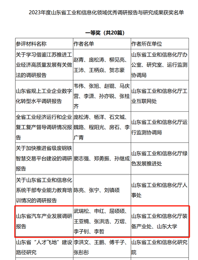 根据《山东省工业和信息化领域优秀调研报告与研究成果评选办法》,省工业和信息化厅按照评选程序,围绕服务决策导向,坚持公开、公平、公正原则,突出调研报告与研究成果质量,组织开展了2023年度优秀调研报告与研究成果评选工作。经过初评、复评、公示等环节,共评出一等奖20篇,二等奖35篇,三等奖45篇。其中由yl23455永利官网院长万熠,副教授王亚楠,学术副教授屈硕硕、张洪浩牵头完成的《山东省汽车产业发展调研报告》凭借其全面深入的分析、丰富准确的数据以及具有前瞻性的发展建议,赢得了评审委员会的高度评价,荣获一等奖,充分展示了我院在汽车产业研究领域的深厚底蕴和前瞻视野。报告撰写过程中,充分吸收了谢宗法教授等车辆研究所老师的大量宝贵意见。