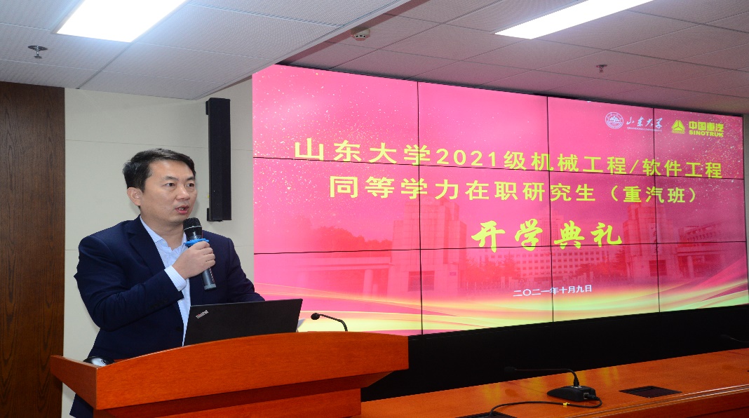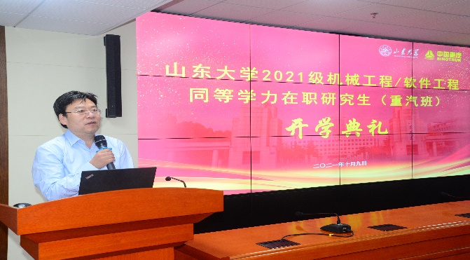 近日,山东大学2021级机械工程/软件工程同等学力在职研究生(重汽班)开学典礼在山东大学千佛山校区隆重举行。山东大学研究生院副院长、机械工程学院常务副院长万熠,软件学院党委书记仇道滨,机械工程学院副院长姚鹏,中国重汽集团组织与人力资源部部长黄维彪,中国重汽集团组织与人力资源部教培中心主任李占山等领导出席了开学典礼。典礼由机械工程学院副院长贾存栋主持。