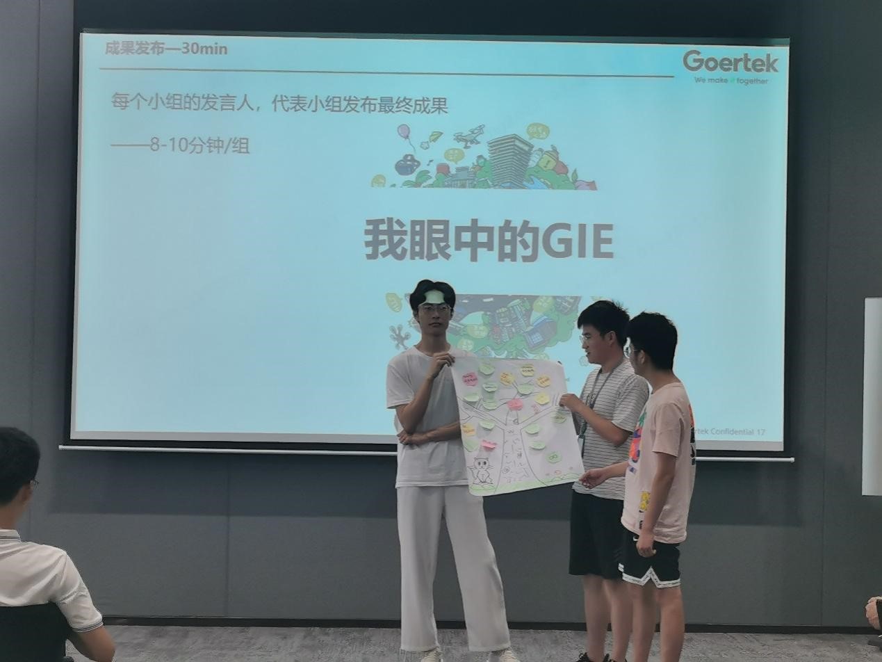 机械工程学院歌尔暑期训练营经过两周多的实习实践迎来了最后一天的收官之日。训练营营员们一早来到歌尔培训室。按照计划安排,上午在歌尔培训师带领下进行团队共创活动。首先,经过智慧大比拼等一系列互动游戏,培训师与营员们营造了一种和谐欢快的氛围。后面就进入共创活动的主要环节-“我眼中的GRE”。培训师将营员们分为三组,在相互竞争下模式下,分组展开头脑风暴,讨论在GIE部门的感受和感想。讨论过后,由组长带领组员在图纸上绘制GIE部门的形象。各小组成员积极发挥聪明才智,用彩笔绘制出创意十足的GIE部门的形象。之后,各小组选派成员上台对本组的作品进行展示和讲解。经过所有成员的投票,最终选出优胜的小组并获得了纪念奖品。