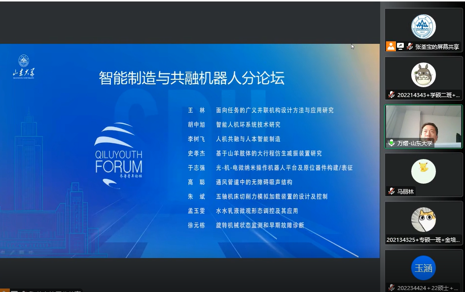1111日下午3,由机械工程学院承办的第七届齐鲁青年论坛智能制造与共融机器人分论坛通过线上方式举行,来自海内外9个高校院所的青年学者作了系列讲座。机械工程学院院长万熠教授参加论坛并讲话,讲座由机械工程学院马丽林老师主持。