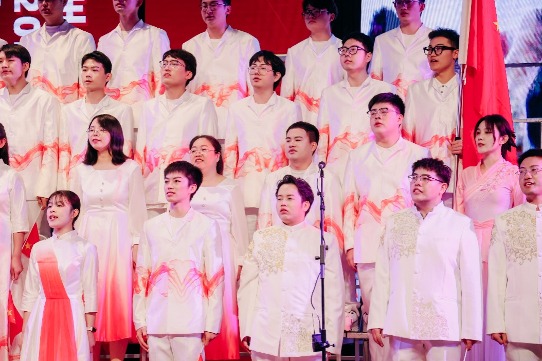 在本次比赛中,机械工程学院选择了具有深远历史意义的《走向复兴》作为参赛曲目。歌曲旋律激昂澎湃,歌词充满了深厚的爱国情怀。为了更好地呈现这首歌曲的激情和力量,合唱团特别设计了极具特色的挥旗动作,辅以舞蹈伴舞,整个表演环环相扣,层层推进,让观众深受感动。舞台上的师生们神情专注,情感充沛,以饱满的声音和流畅的动作,生动地表达了对祖国未来的美好祝愿。