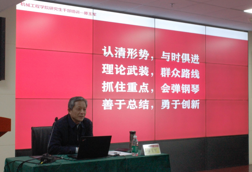 学院党委副书记滕玉军首先就研究生骨干工作开展做了讲话。他指出,研究生骨干培训实质上是思想作风的建设,是工作理念的交流。学生干部要明确工作方向,认清形势,与时俱进;要把握策略,用马克思主义理论武装头脑,坚持群众路线;要抓住重点,运用正确的工作方法解决问题;要善于总结,勇于创新。他还强调机械工程学院的学生干部要把握实践教育这一特点,并将其运用到到实际工作中去,在产学研教竞融通中实现自我提升。