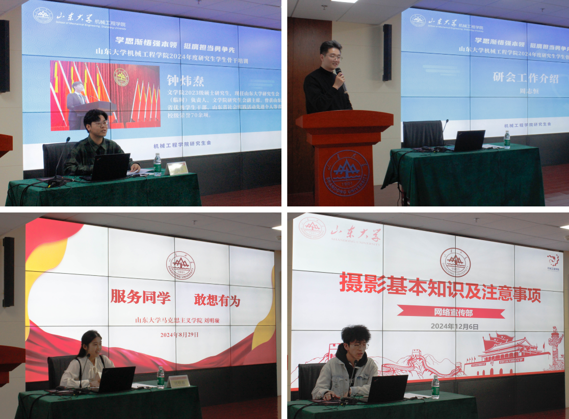 为深入贯彻学习习近平新时代中国特色社会主义思想,全面提升机械工程学院研究生骨干的政治素养、综合能力和服务意识,2024年12月6日机械工程学院在创新大厦1103会议室举办了“学思践悟强本领 挺膺担当勇争先”第二期学生骨干培训活动。学院党委副书记滕玉军出席并讲话、山东大学研究生会负责人钟炜焘、校团委学生兼职副书记刘明璇分别做了工作经验分享交流,辅导员宋小霞、研究生会全体成员、各党支部委员会全体成员及各班委员会全体成员参加活动。